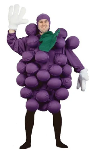 Grape Cluster CostumeBalloonHeadpieceShow off your fruity side in this purple grapes costume! The funny costume includes a purple tunic made from polyester. The tunic has long sleeves and an attached dark green leaf at the top. The entire tunic is covered in round pocket-like pieces of fabric. They inflate when the included balloons are placed in them and blown up to give the appearance of juicy grapes. A matching purple hood lined with elastic is also included. Slip on our cartoon hands and join up with our green grapes, apple and banana costumes for a Fruit of the Loom group!