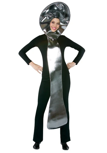Spoon costumeYou might be tempted to run away with the dish in this adult spoon costume, if someone isn’t careful! This is a funny adult novelty food costume. It measures 49″ from the head opening to the base and 66″ in total from the base to the tip of the spoon. The polyfoam spoon is silver with black backing. There is an extra mesh piece behind the head opening so your spoon will stay in place. Pair up with the adult fork and set the table for a great Halloween!