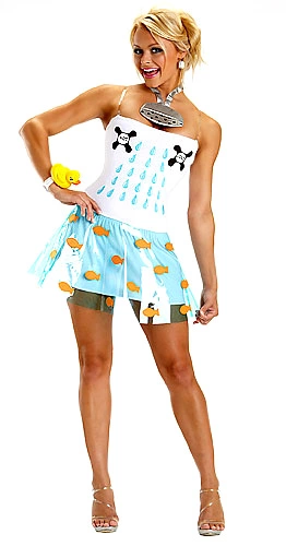 Dress w/Vinyl Overskirt and Removable StrapsShower Head NecklaceRubber Duckie BraceletLet everyone know you’re not shy in this bathing beauty costume! The women’s costume includes a white, polyester dress that zips in the back for closure. The strapless dress also comes with removable clear straps for extra support. The top features blue water drops screenprinted on the front as well as hot and cold water knobs. A sheer blue vinyl overskirt has the appearance of a shower curtain and features orange fish. The shower head necklace is made from poly foam and velcros into place. The costume is complete with a rubber duckie bracelet that also velcros into place. A sexy and funny costume for Halloween!
