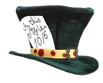 Child Mad Hatter HatAdjustable – One Size (22” Circumference)Finish off your Alice in Wonderland Mad Hatter costume with this officially licensed child Mad Hatter hat. This kid’s cotton / poly blend green velvet-like top hat includes an oversized felt “In this style 10/6″ patch. A yellow polyester band with felt maroon circles and molded buckle add authenticity to the hat. An adjustable strap inside hat brim ensures a secure and comfortable fit. The brim is approximately 2″ in width and the overall hat diameter is 11 1/2″ and it is approximately 5 1/2” tall. To get the full height of the hat, there is an interior zipper that hides an extra section that you can stuff. Add this amazingly detailed hat to any Mad Hatter costume for an authentic storybook look.