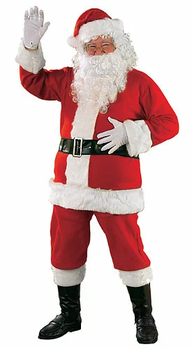 Pullover JacketPants w/PocketsBeltBoot TopsHatGlovesBring joy to children around the world as Santa Claus in this realistic suit! Great for any holiday event, this costume includes a red, pullover jacket that buttons at the back of the neck for closure. It is made from polyester but has the feel and appearance of flannel. It is trimmed in white, faux fur along the collar, torso, cuffs and bottom. The matching, red pants have an elastic waistband and two pockets to keep your goodies in. The costume also includes a traditional Santa hat, white gloves, black belt and boot covers. The boot covers have a faux fur cuff and the appearance of leather. Get Santa’s complete look when you add our coordinating beard and wig set and stuffed belly!
