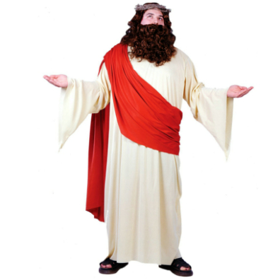 The Jesus Plus Adult costume includes a beige robe featuring bell sleeves and an attached red shoulder drape. Also includes a crown of thorns and a Wig and Beard set. A great garment for school plays or theatrical performances.