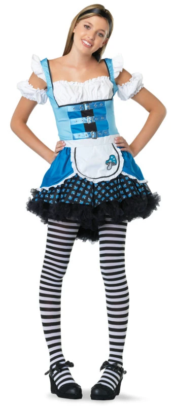 This enchanting ensemble features white peasant top with detached puffed sleeves, light blue bodice with blue and black detail and matching belt-style lace up. Her attached skirt features a blue and white apron-style overskirt with woven mushroom applique, black tiered dress with blue mushroom screen-prints. An adorable outfit for a night of magical mischief!