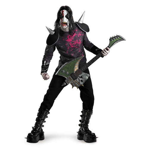 Demented and cool, this Rot N’ Rocker is ready to make some noise! This Metal Mayhem Adult Costume includes a long-sleeved printed shirt, detachable shoulder armor, a pair of black gauntlets, and a chinless character mask with hair. Whether you are dressing up as a rock band member of Kiss or are creating your own metal rock star image, you will be ready to take the rockband stage dressed in this Metal Mayhem Rocker Adult Costume.