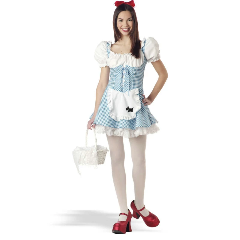 The Wizard of Oz heroine gets hip in this outfit, which features a Blue and White checked dress with lace-up corset and crinoline skirt accent. Attached apron with Toto artwork is a fun finishing touch.