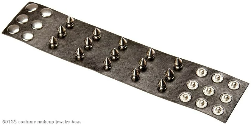 Complete a rockin’ look with this tough guy cuff! It features a rocker and gothic-inspired look, with a black faux leather band, silver snaps, and silver spikes all around the band.