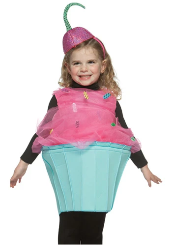 Toddler cupcake tunicHeadpieceShe will be the sweetest treat at any party in this toddler cupcake costume. This funny costume features a cupcake shaped tunic made of 100% polyester material. It is pink on top covered in pink mesh and sequin covered sprinkles. There is a Velcro clasp behind the neck to secure the costume. The bottom is a light blue, felt-like material that resembles a pleated cupcake wrapper. The costume is open on the bottom for easy movement. A sequin-covered, cherry-shaped headpiece is included to top off this costume. It is attached to a headband for easy wear. This cute costume comes in a toddler size and in a small child size as well.